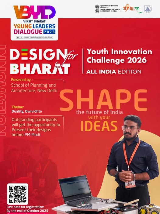 आईआईटी रुड़की, उत्तराखंड / विकसित भारत यंग लीडर्स डायलॉग 2026 के अंतर्गत आयोजित “डिज़ाइन फॉर भारत – यूथ इनोवेशन चैलेंज” एक राष्ट्रीय स्तर की डिज़ाइन प्रतियोगिता है, जिसका उद्देश्य 18 से 29 वर्ष आयु वर्ग के युवाओं को विकसित भारत @2047 के दृष्टिकोण के अनुरूप नवाचारी डिज़ाइन समाधान विकसित करने के लिए प्रोत्साहित करना है। यह पहल युवा कार्य मंत्रालय तथा खेल एवं युवा कार्य मंत्रालय, भारत सरकार द्वारा आरंभ की गई है। यह प्रतियोगिता भारत की सामाजिक, आर्थिक एवं सांस्कृतिक चुनौतियों से संबंधित डिज़ाइन हस्तक्षेपों पर केंद्रित है तथा सामाजिक प्रभाव और नवाचार को प्रोत्साहन देती है। यह पहल चार चरणों में संरचित है, जिसका समापन नई दिल्ली में आयोजित राष्ट्रीय प्रदर्शनी एवं पुरस्कार समारोह के साथ होगा।