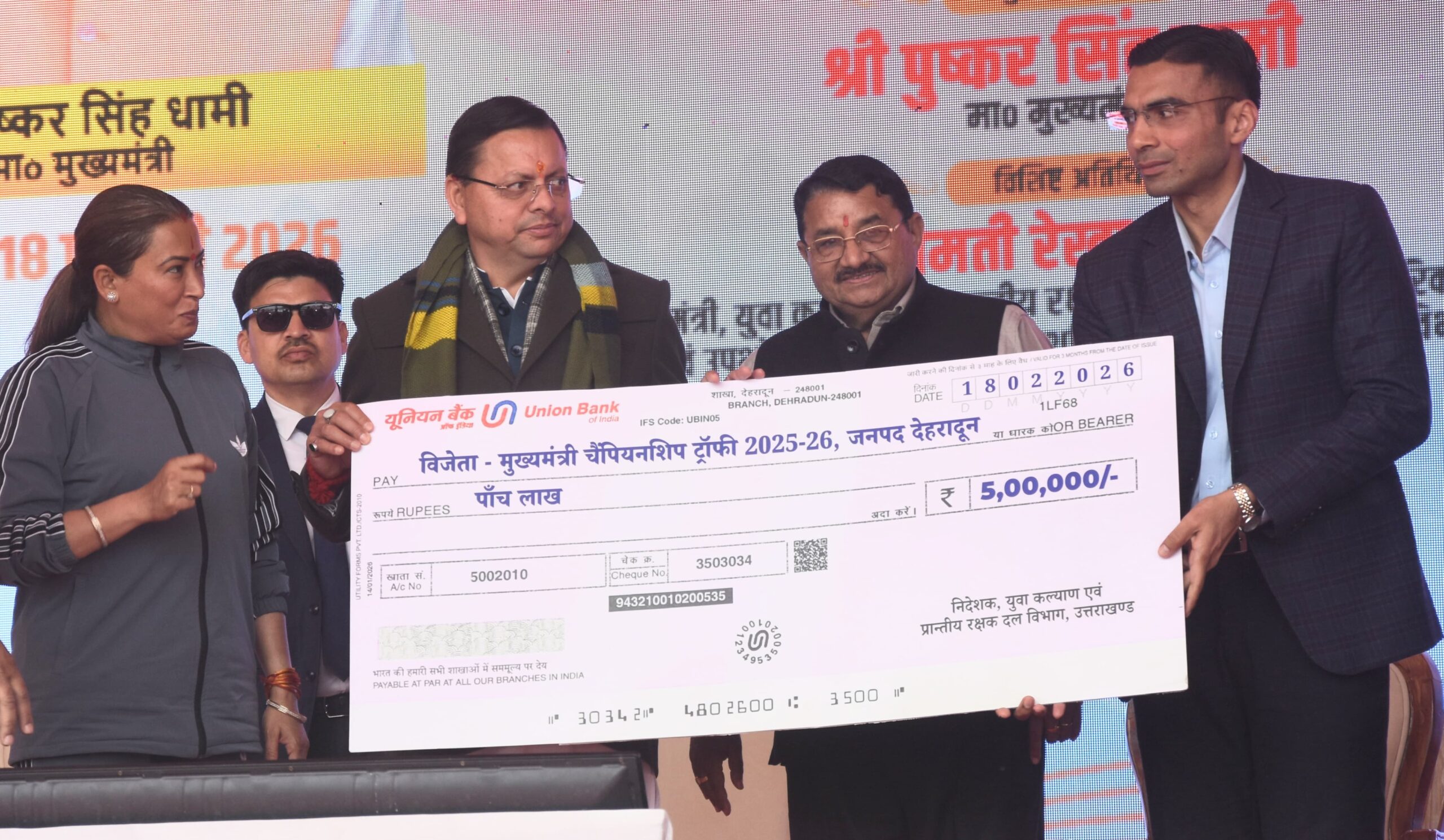 देहरादून | ननूरखेड़ा मिनी स्टेडियम में मुख्यमंत्री चैंपियनशिप ट्रॉफी 2025-26 के राज्य स्तरीय मुकाबले में देहरादून जनपद की टीम विजेता बनी है। विजेता टीम को प्रदेश के मुख्यमंत्री पुष्कर सिंह धामी और कैबिनेट मंत्री रेखा आर्या ने ट्रॉफी एवं 5 लाख रुपये का चेक देकर सम्मानित किया।